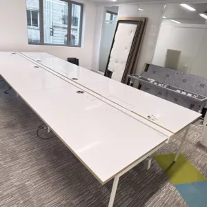 Plateaux de bureau couleur blanc, surface résistante, lisse et facile d’entretien. Structure avec piètement métal professionnel garantissant stabilité, robustesse et durabilité pour un usage intensif en environnement tertiaire.