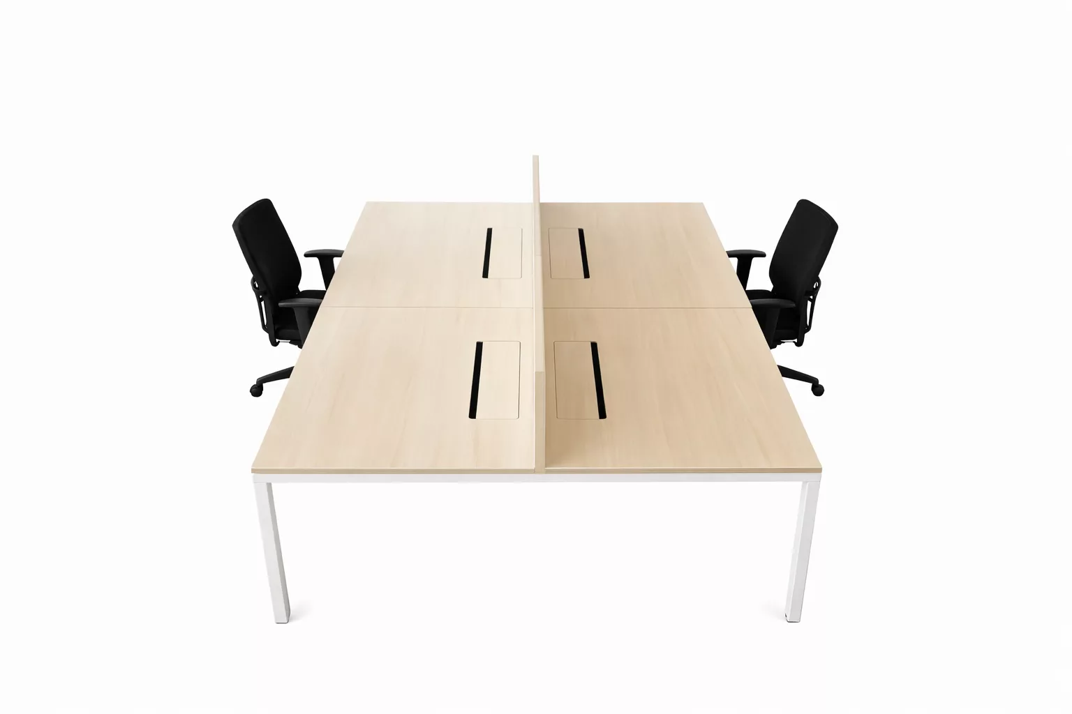 Un séparateur central pleine longueur, assorti au plateau, sépare les deux rangées de postes afin de structurer l’espace et d’améliorer le confort visuel entre les utilisateurs.
