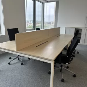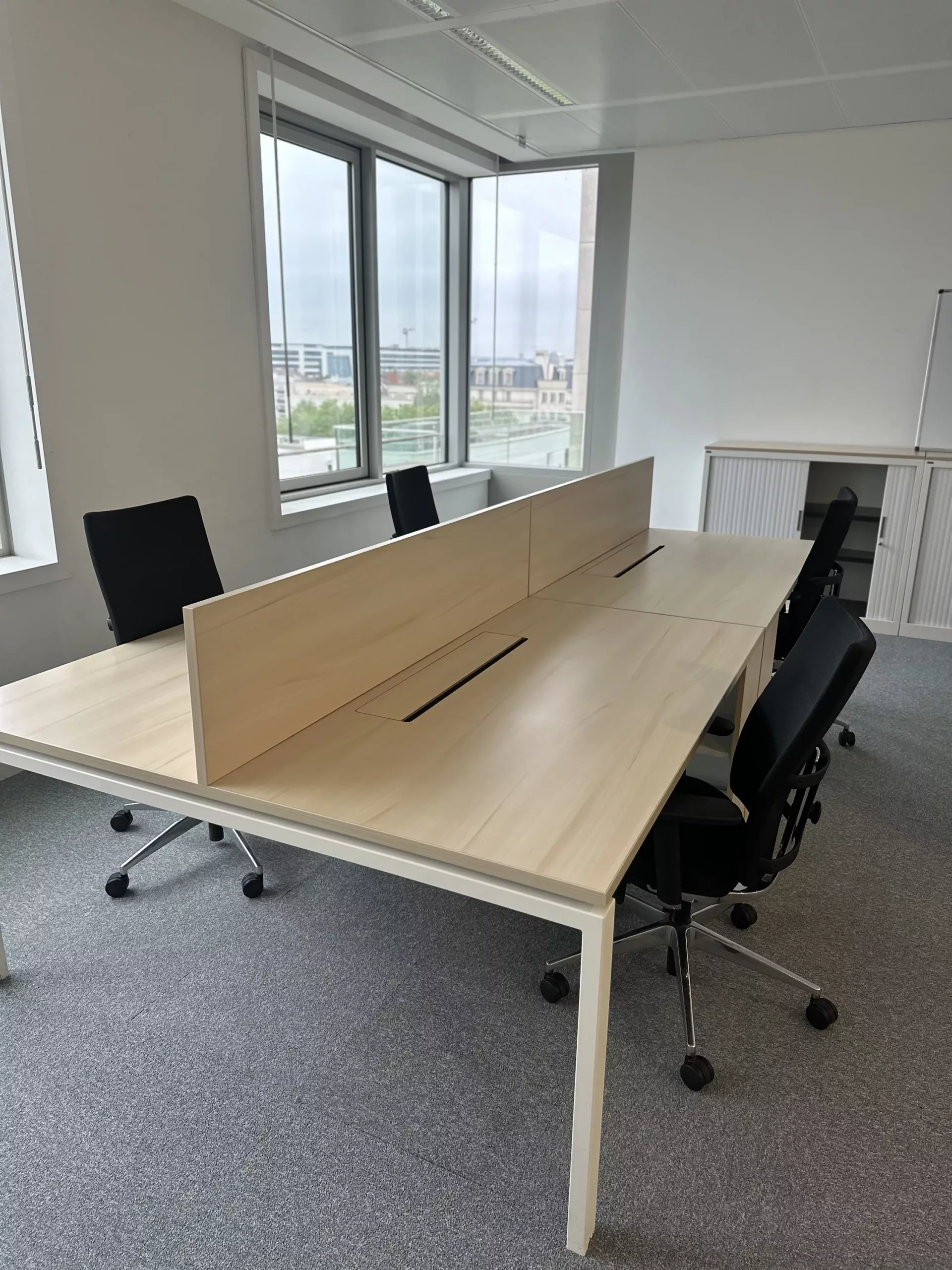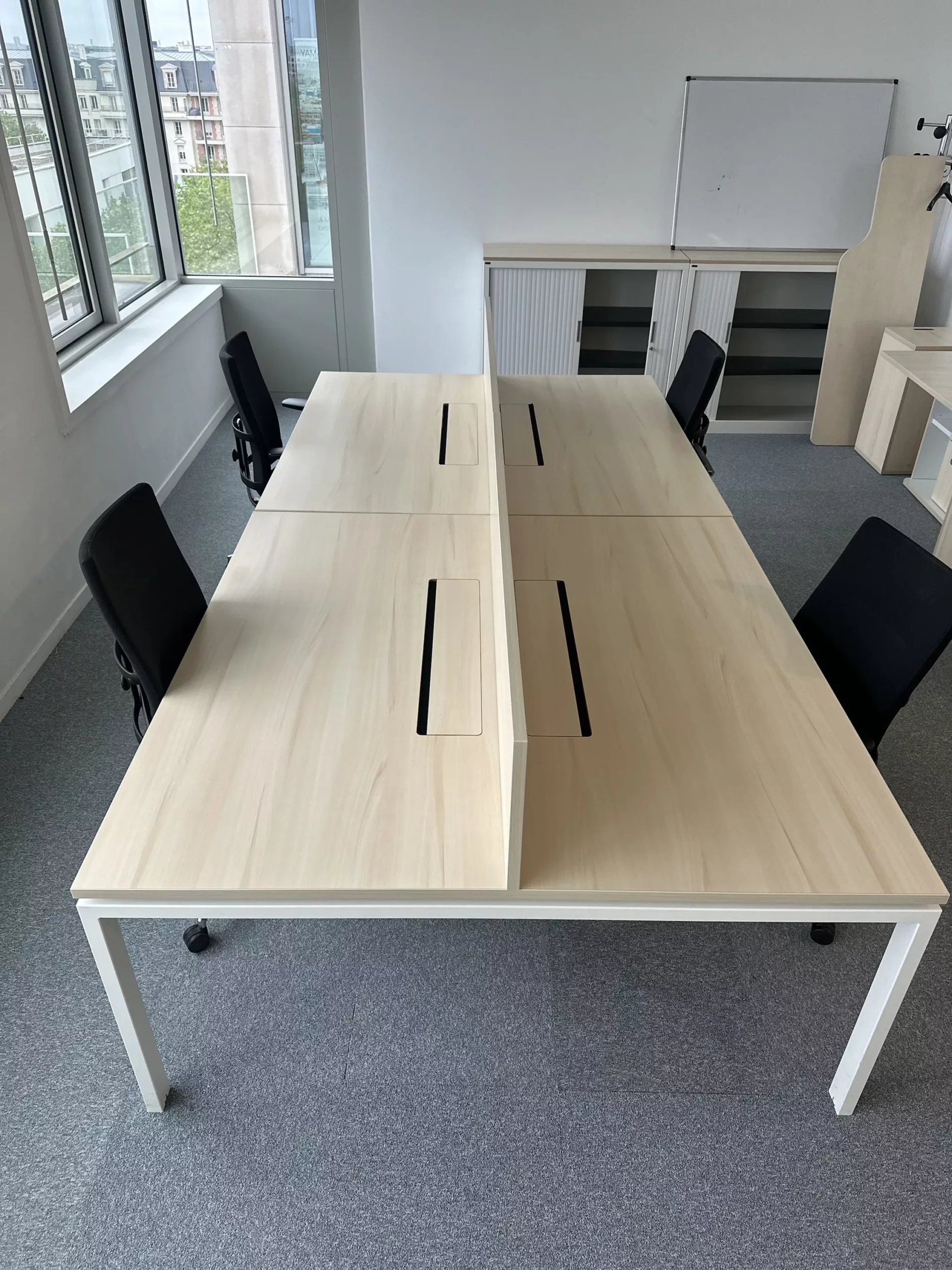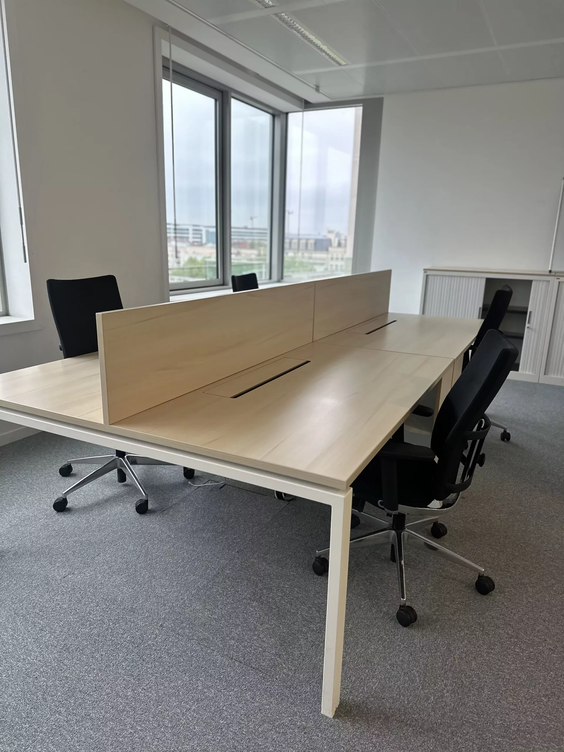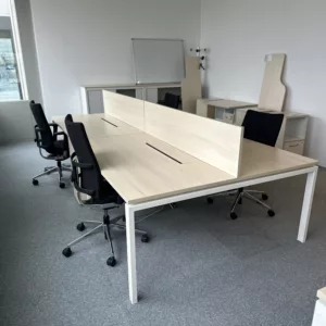bureau bench 4 places, bureau open space 4 postes, bureau bench professionnel, bureau 320×160, bureau érable entreprise, bureau avec séparateur, bureau avec trappe passe câble, mobilier de bureau professionnel occasion, bureau collaboratif entreprise, bench bureau open space
