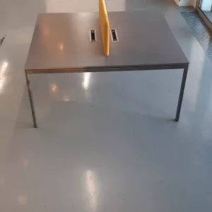 Plateaux finition gris clair, piètement métal robuste et stable.