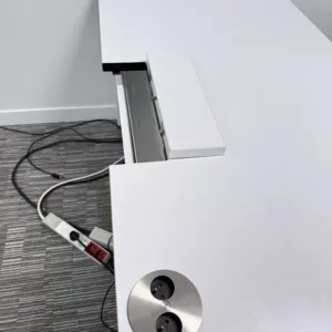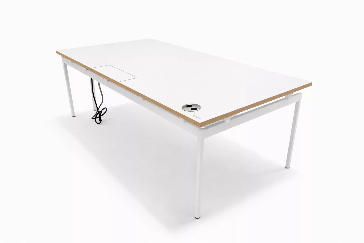 Le plateau blanc, sobre et professionnel, est associé à un chant bois clair (érable apparent), apportant une touche esthétique moderne et qualitative. Cette combinaison de couleurs s’intègre facilement dans tous les environnements de travail contemporains.