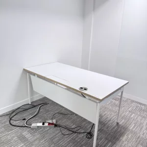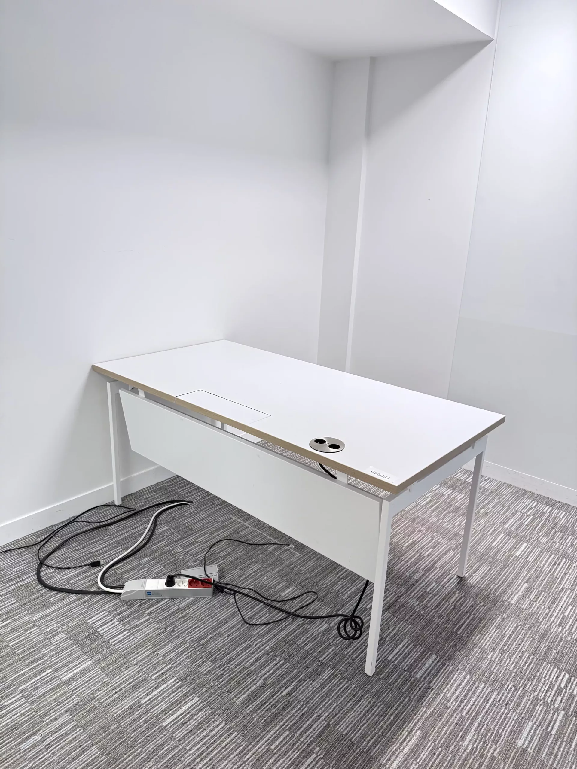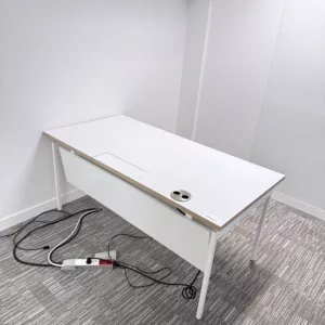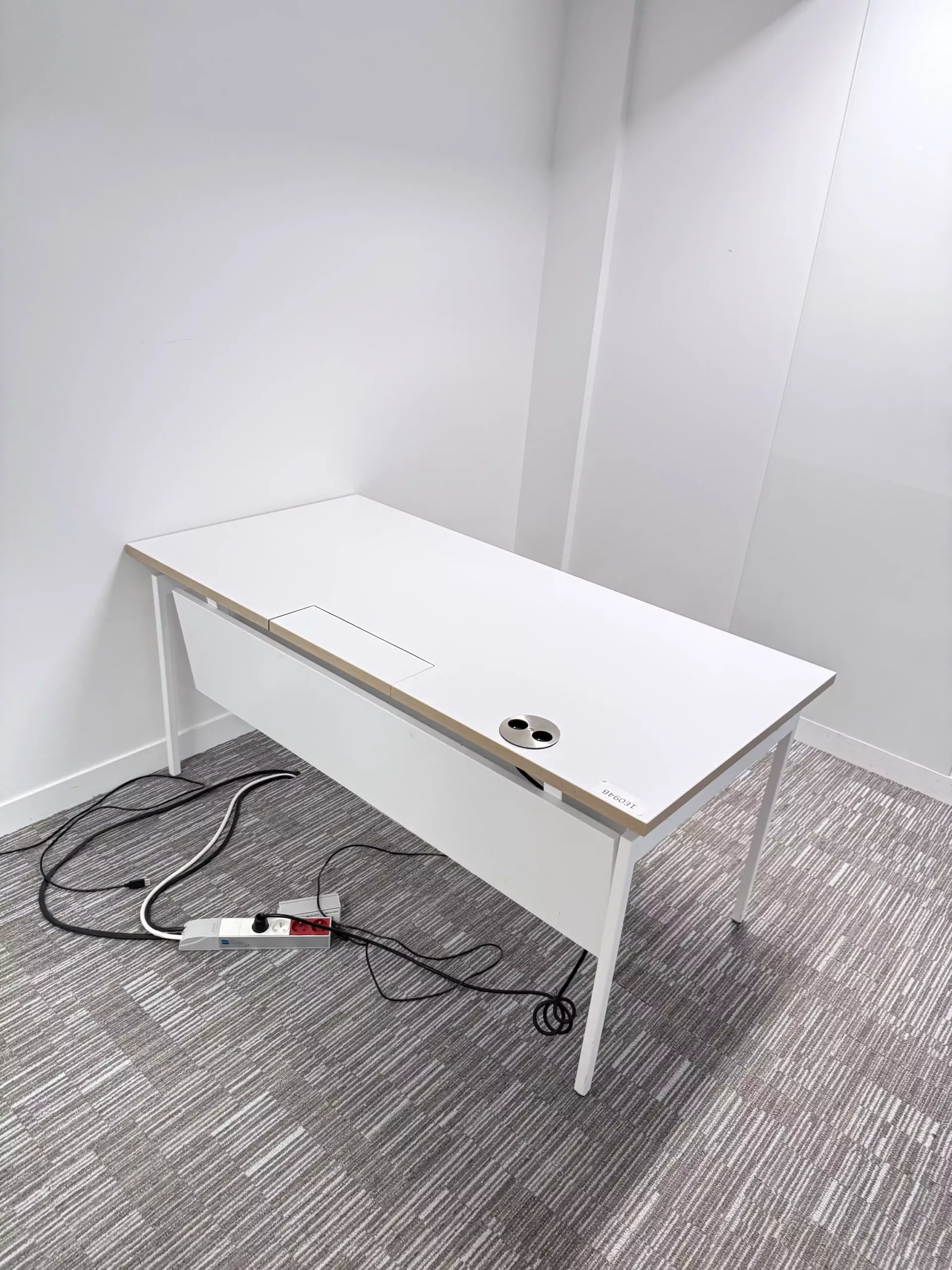 bureau professionnel Steelcase, bureau 140×70 cm, bureau blanc professionnel, bureau avec trappe passe-câbles, mobilier de bureau professionnel occasion, bureau entreprise Steelcase, bureau individuel open space, bureau avec gestion des câbles