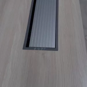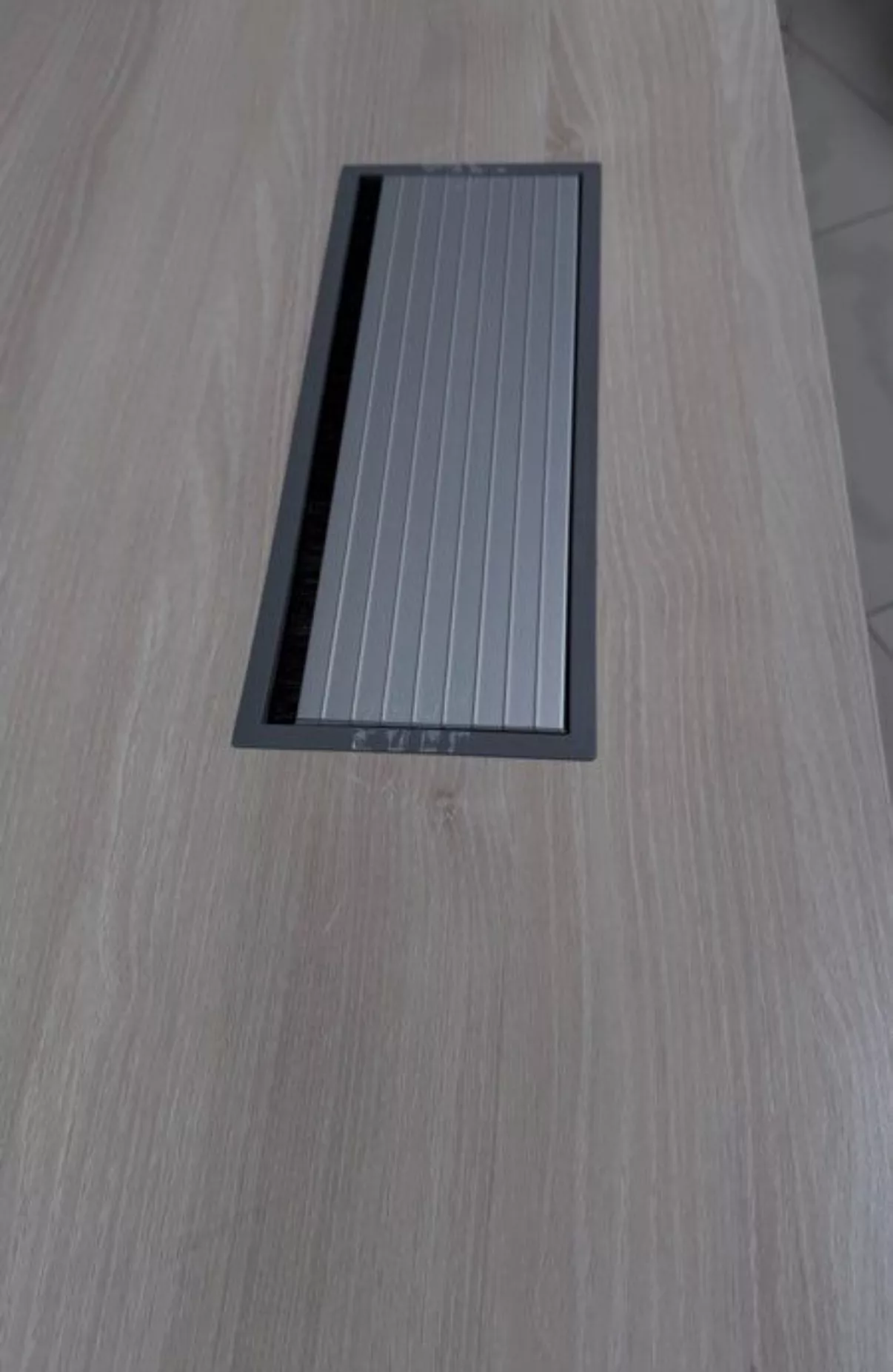 Une trappe passe-câbles intégrée est directement encastrée dans le plateau. Elle permet un passage propre et discret des câbles (alimentation, écrans, informatique), contribuant à un poste de travail organisé, fonctionnel et sans encombrement visuel.